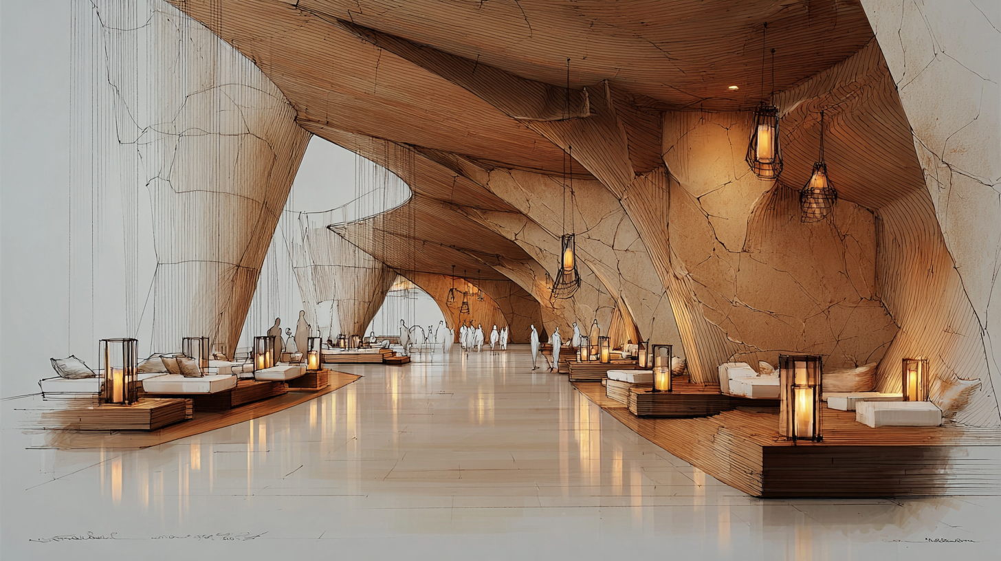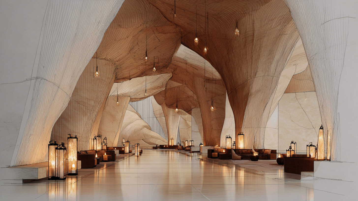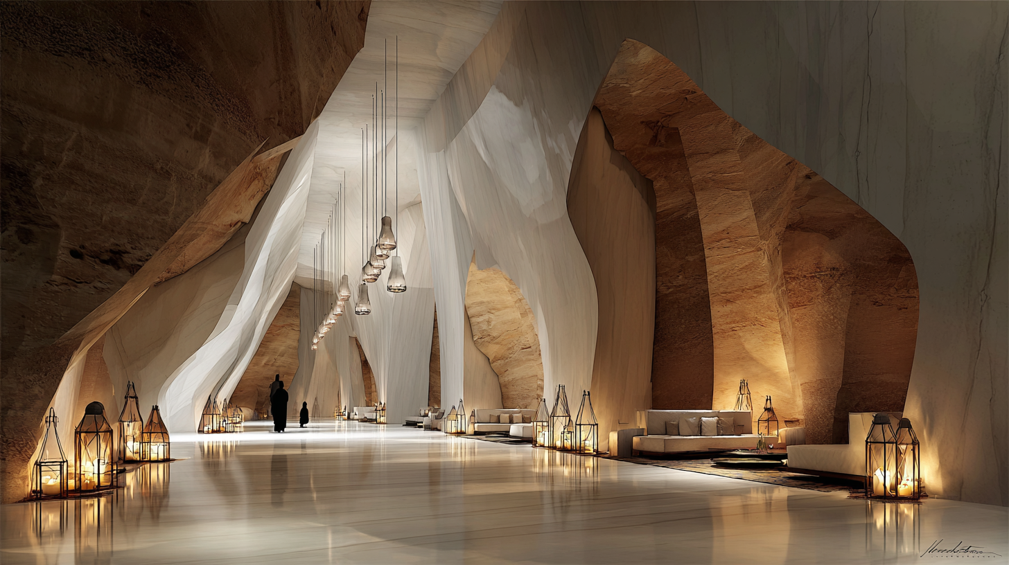 The space balances monumentality with intimacy: a grand passage softened by flowing forms, reflective floors mirroring the sky after rain, and quiet seating niches offering moments of pause as oases along a journey. Light filters from above as it does at dawn in the desert, transforming stone into silk and shadow into story.